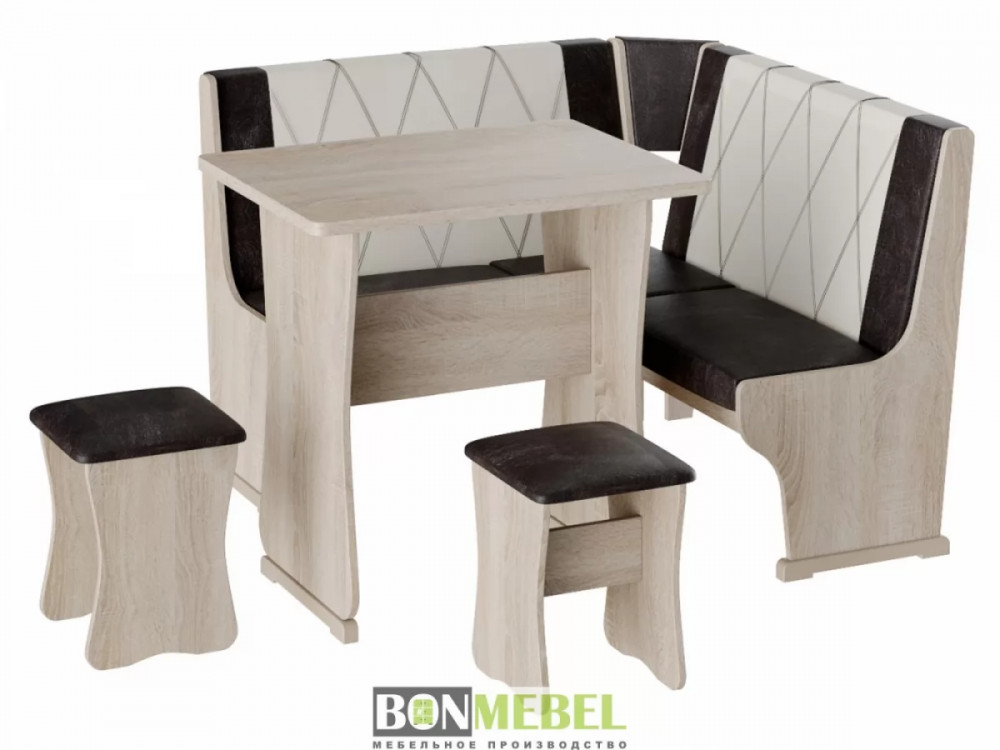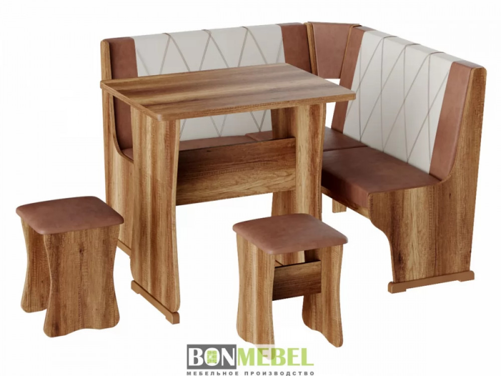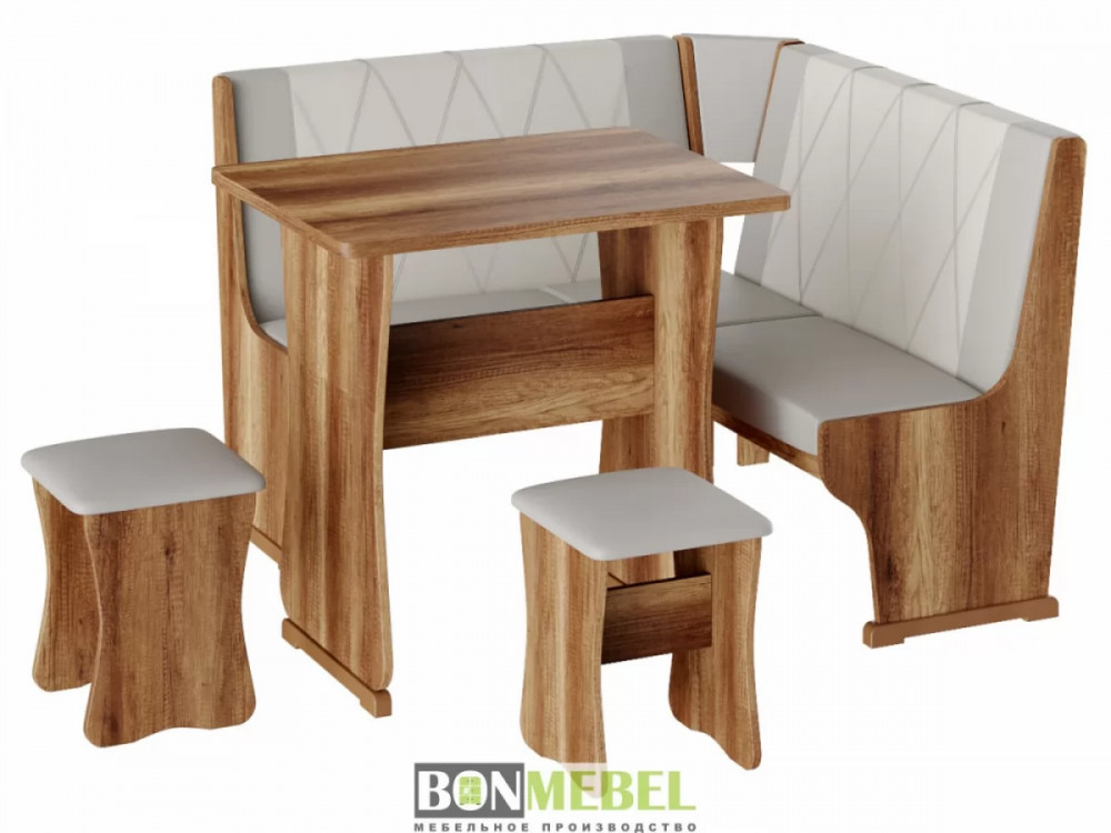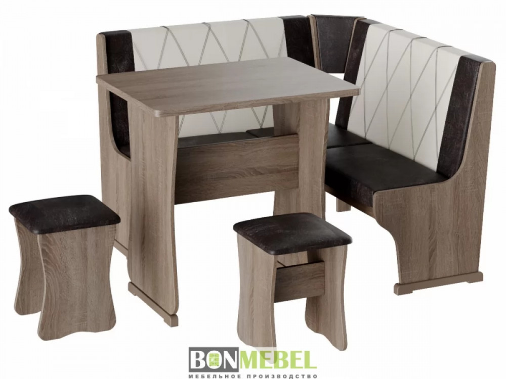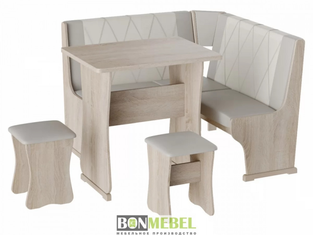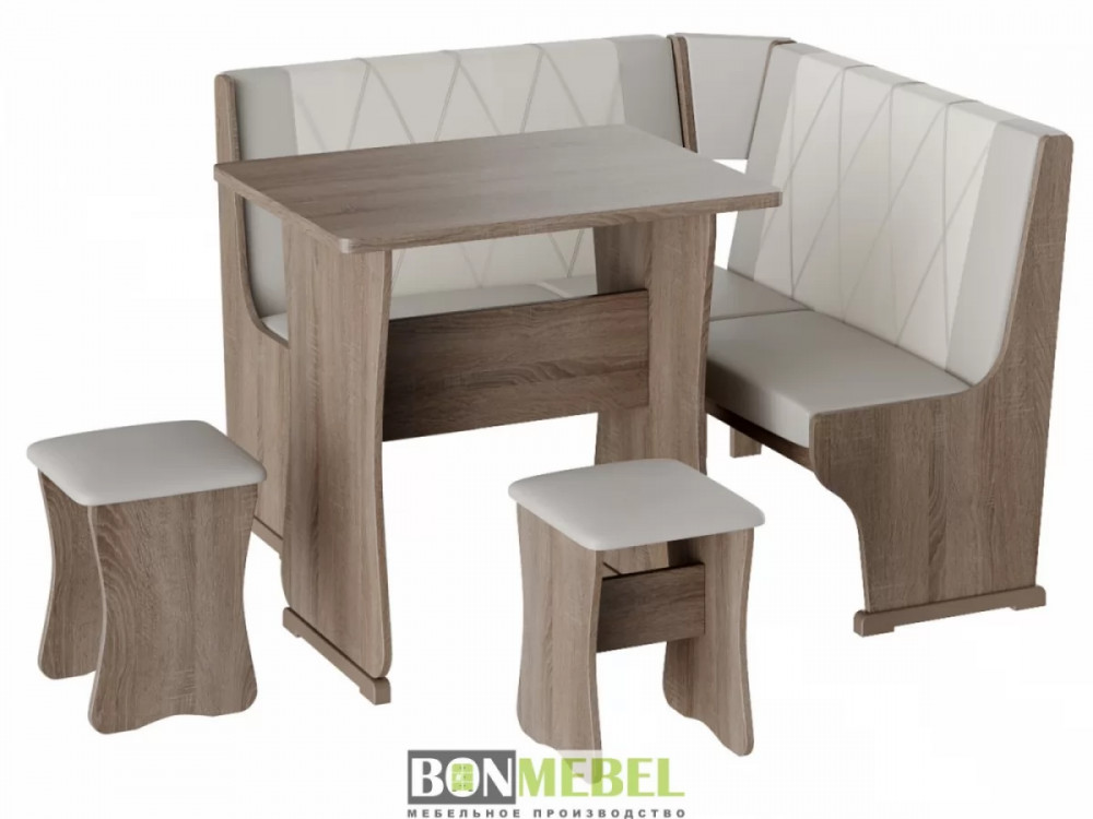 Небольшой оригинальный уголок для кухни. Такая модель выглядит изящно и современно, она придется по вкусу тем, кто любит уют и комфорт. Сборка скамьи универсальная, вы можете определить угол как с правой, так и с левой стороны. Обивка на табуретах и скамье выполнена из искусственной кожи с наполнителем из поролона. Каркас изделий изготовлен из ЛДСП, на ножках установлены пластиковые накладки. Конструкция не оснащена ящиком для хранения.