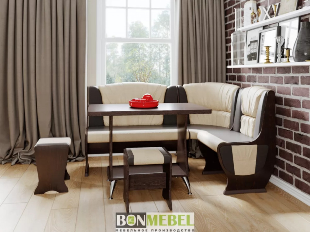 Мягкий уголок для кухни с оригинальной обивкой добавит уюта кухонному интерьеру. Особенно понравится такая модель тем, кто любит долгие посиделки с семьей или друзьями за чаепитие. Сборка скамьи универсальная — вы можете определить угол как с правой, так и с левой стороны. Скамья дополнена двумя ящиками под сиденьем. Обивка на табуретах и скамье выполнена из искусственной кожи с наполнителем из поролона. Каркас изделий изготовлен из ЛДСП, на ножках установлены пластиковые накладки.
