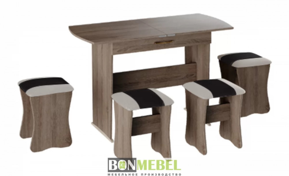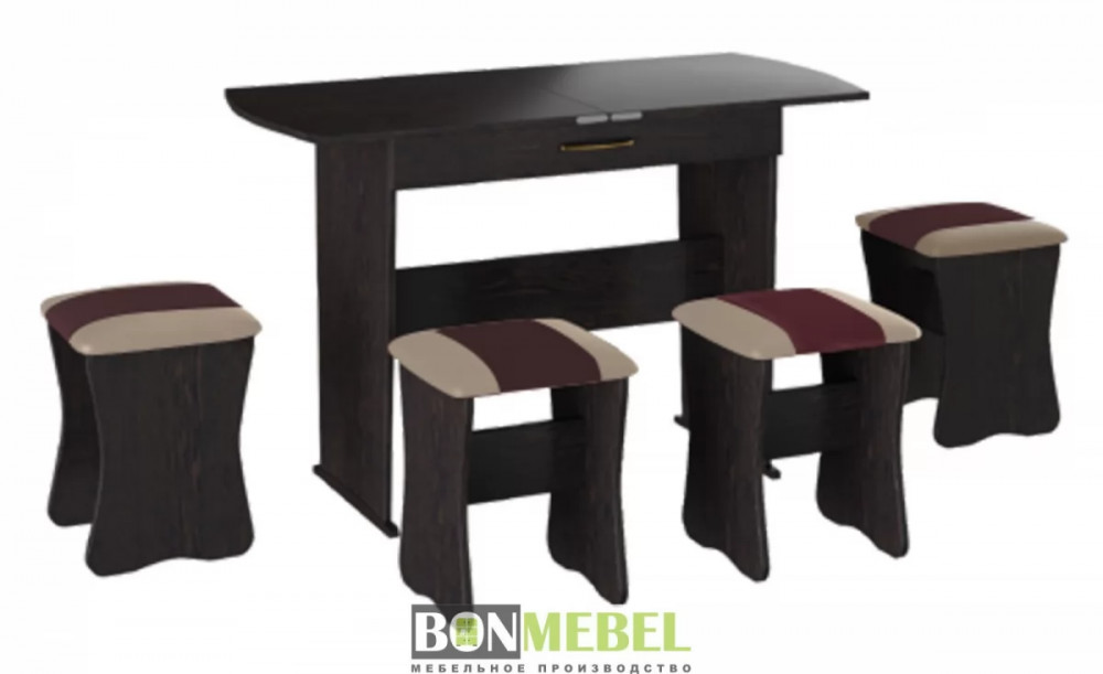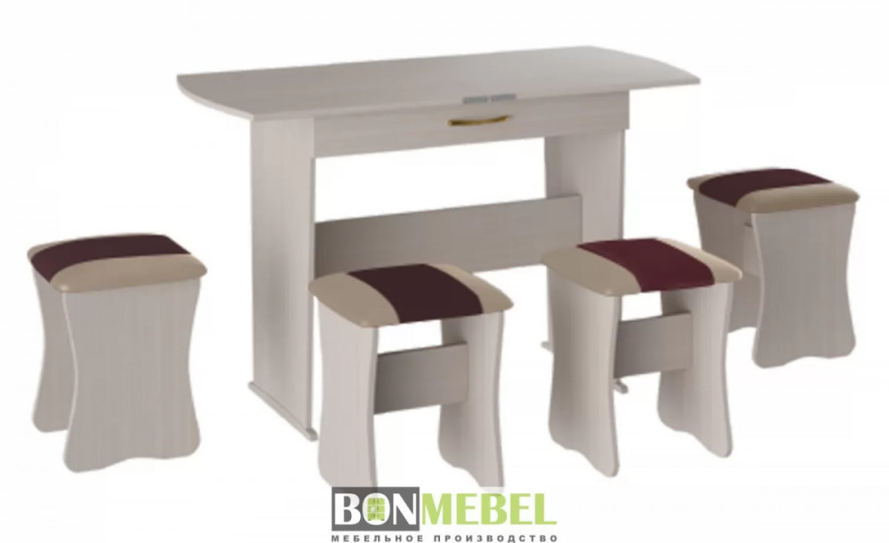 Обеденная группа с табуретами Тип-2 станет практичной и уютной обеденной зоной для вас и ваших гостей. Комплект рассчитан на четыре персоны. Встроенный механизм трансформации позволит увеличить ширину стола почти с 750 мм до 1200 мм. Обивка из экокожи устойчива к различным загрязнениям и не требует обработки специальными средствами. Мягкие сиденья табуретов имеют мягкое и упругое наполнение, что повышает уровень комфортабельности. Различные варианты расцветки помогут подобрать идеальный комплект. Для изготовления изделий используется прочная ЛДСП. Обивка табуретов выполнена из искусственной кожи.