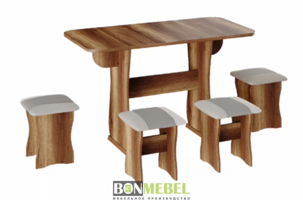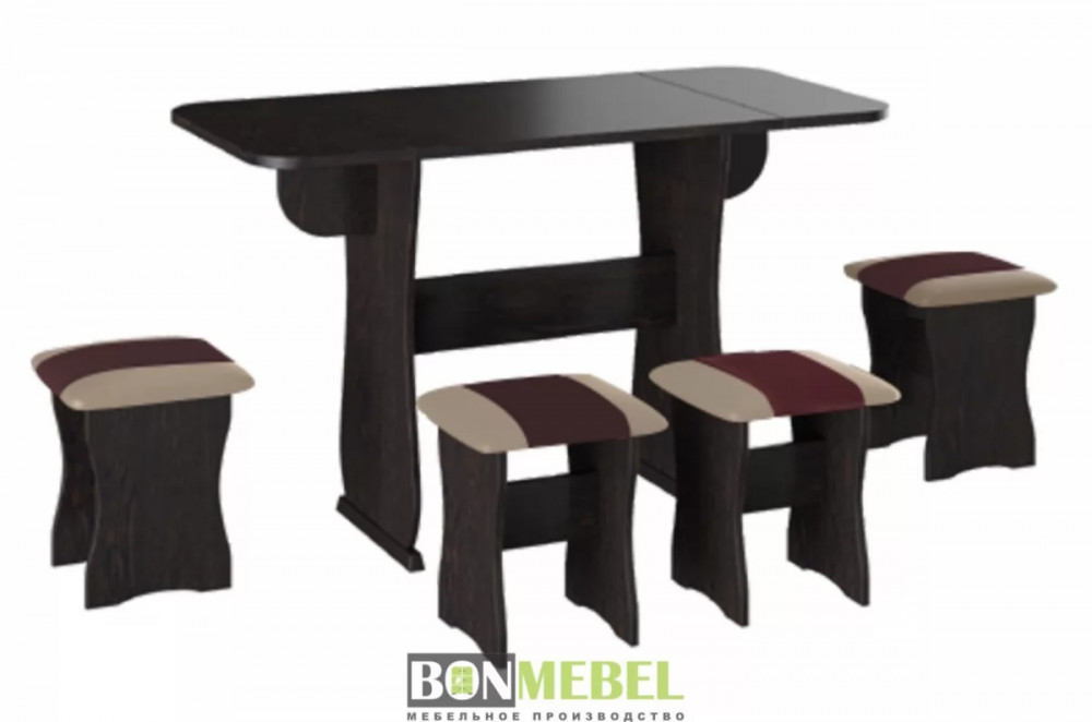 Обеденная группа с табуретами Тип-4 поможет стильно и практично оформить пространство даже на малогабаритной кухне. Комплект рассчитан на четыре персоны. Раскладной стол позволит увеличить ширину стола почти на 55 см за считанные секунды. Обивка из экокожи устойчива к различным загрязнениям и не требует обработки специальными средствами. Мягкие сиденья табуретов имеют мягкое и упругое наполнение, что повышает уровень комфортабельности. Различные варианты расцветки помогут подобрать идеальный комплект. Для изготовления изделий используется прочная ЛДСП. Обивка табуретов выполнена из искусственной кожи.