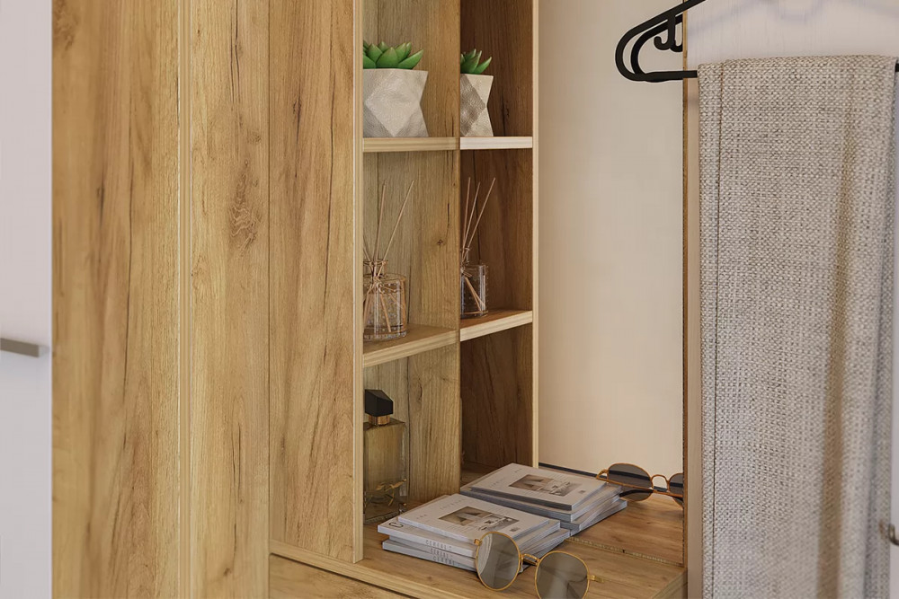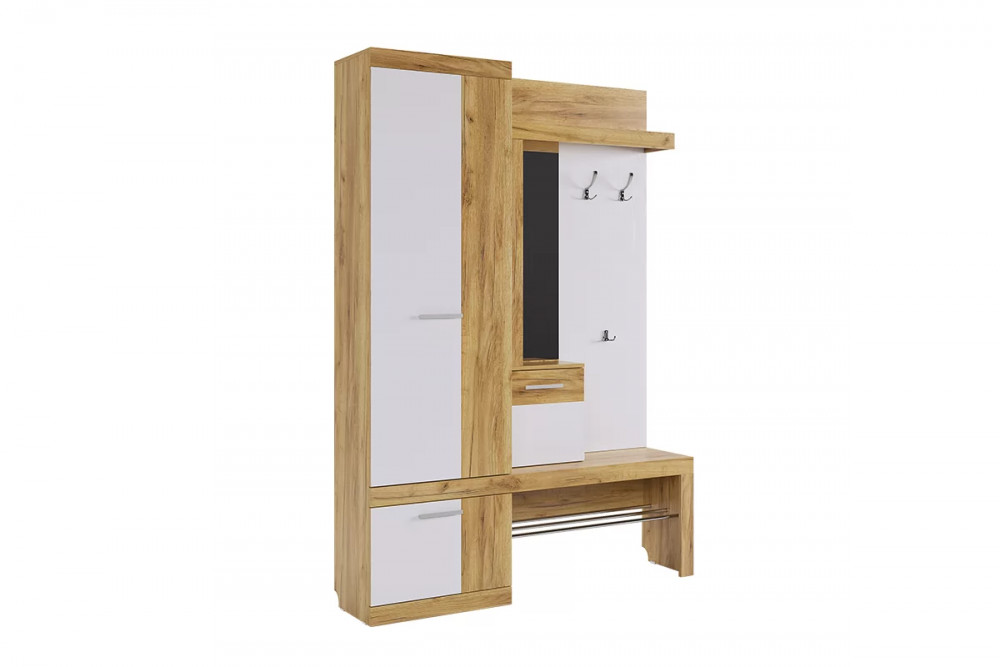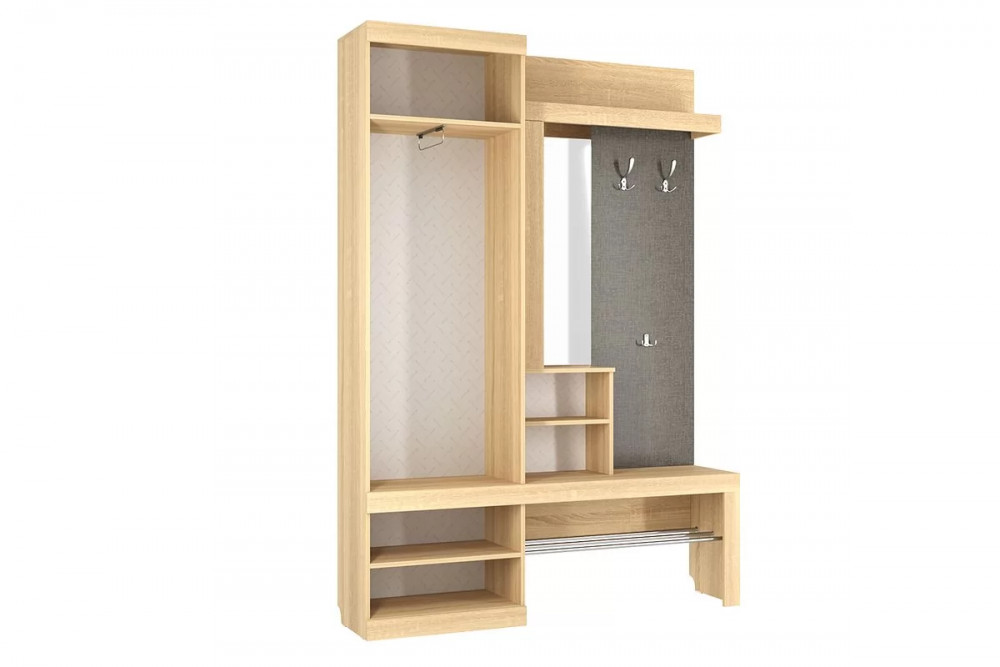 Состоит из крючки для одежды, обувницы, открытой ниши для обуви, открытых полок, зеркала, полки для головных уборов, выдвижного ящика, шкафа для одежды.