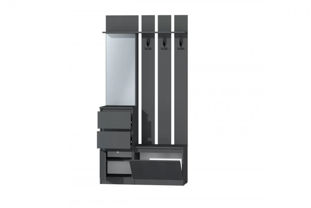 У данной прихожей 2 выдвижных ящика, 1 распашная и 1 откидная створка, отдел с крючками для верхней одежды.