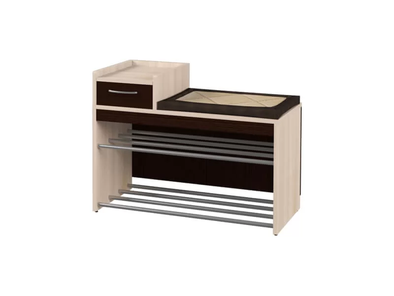 Ширина (мм): 800 Высота (мм): 600 Глубина (мм): 350 Цвет: Ясень шимо светлый/Венге Материал: ЛДСП Стиль: Современный Коллекция: Ольга Корпус: ЛДСП толщиной 16 мм. Выдвижной ящик для мелочей. Открытые полки для сушки обуви. Мягкое сиденье с отделкой из стеганой искусственной кожи. Ручки металлические.
