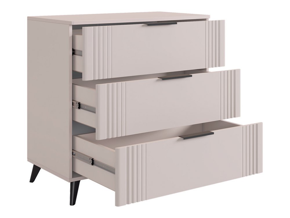 Комод изготовлен из качественных материалов: корпус выполнен из ЛДСП, что гарантирует прочность и долговечность, а фасад, выполненный из МДФ в плёнке ПВХ, не только выглядит эстетично, но и защищает комод от повреждений. Особое внимание заслуживает фрезеровка фасадов, которая придаёт изделию изысканный вид.