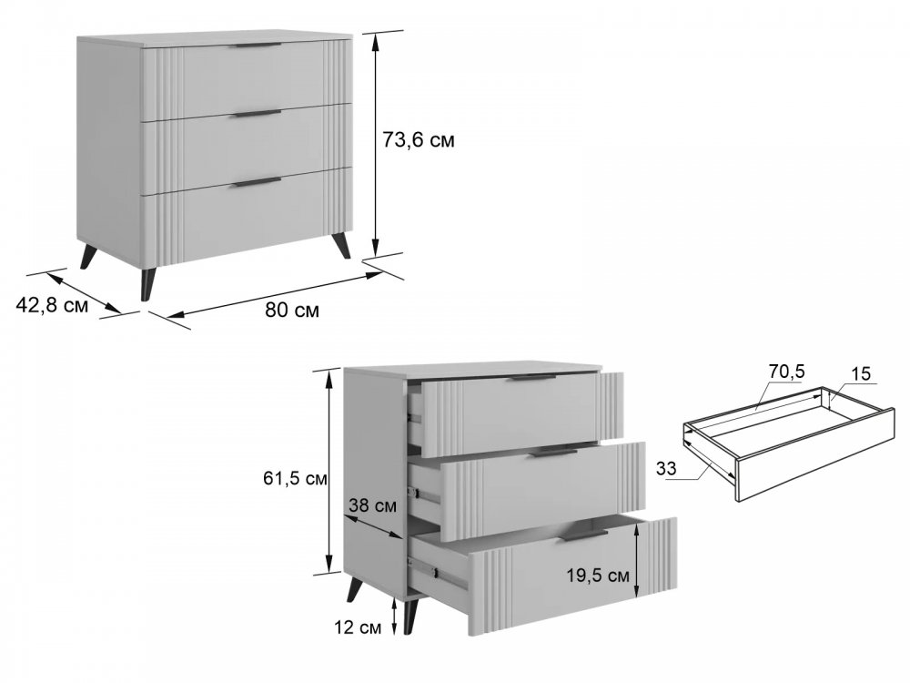 Металлические ручки и выкатные ящики на шариковых направляющих обеспечивают удобный доступ к вещам. Нерегулируемые пластиковые опоры гарантируют стабильность конструкции.