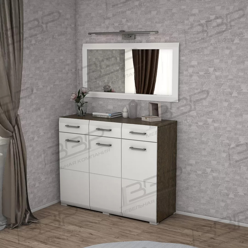 Практичный комод M17 изготавливается из МДФ имеет три выдвижных ящика и тремя створками, разделенных полками для хранения одежды и различных вещей