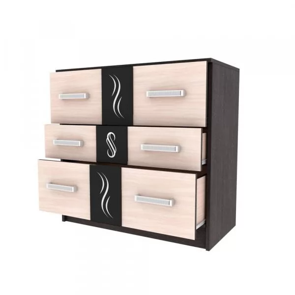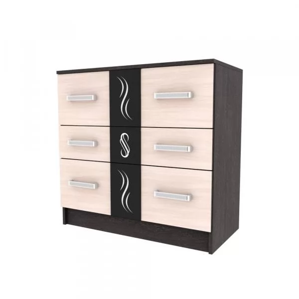 Оригинальные фасады комода Эрика декорированы накладками из стекла с зеркальным рисунком, нанесенным методом Шелкография.