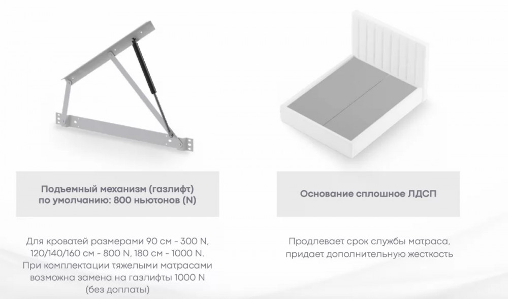 Имеет полный набор доступных опций: комплектация подъёмным механизмом, настилом ЛХДФ, ортопедическим основанием.